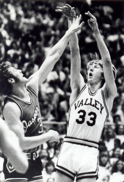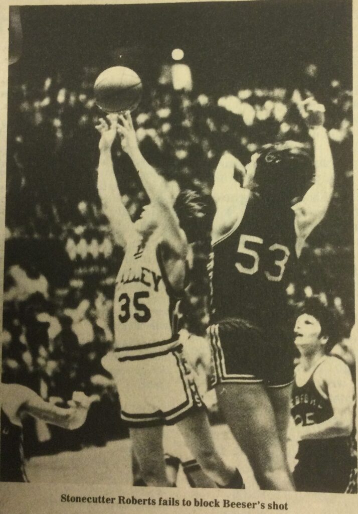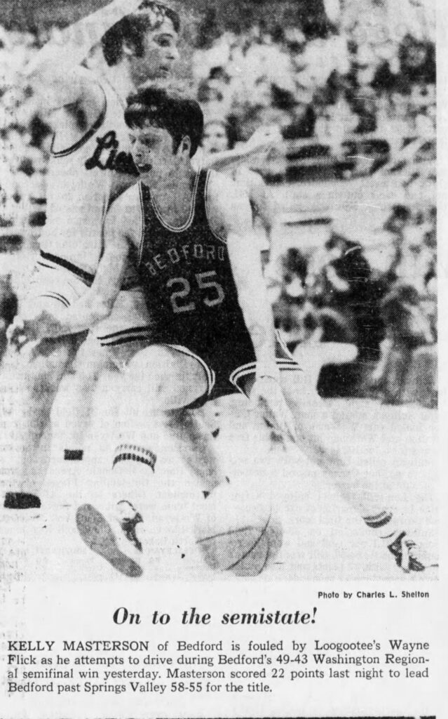 At 5:18 on the clock, Bedford’s Kelley Masterson, a quick little magician of a player, hit from 15 feet out. Then Bedford got the ball back from Valley and rugged 6-6 Jim Pentzer made a shot over Larry from six feet from the basket.