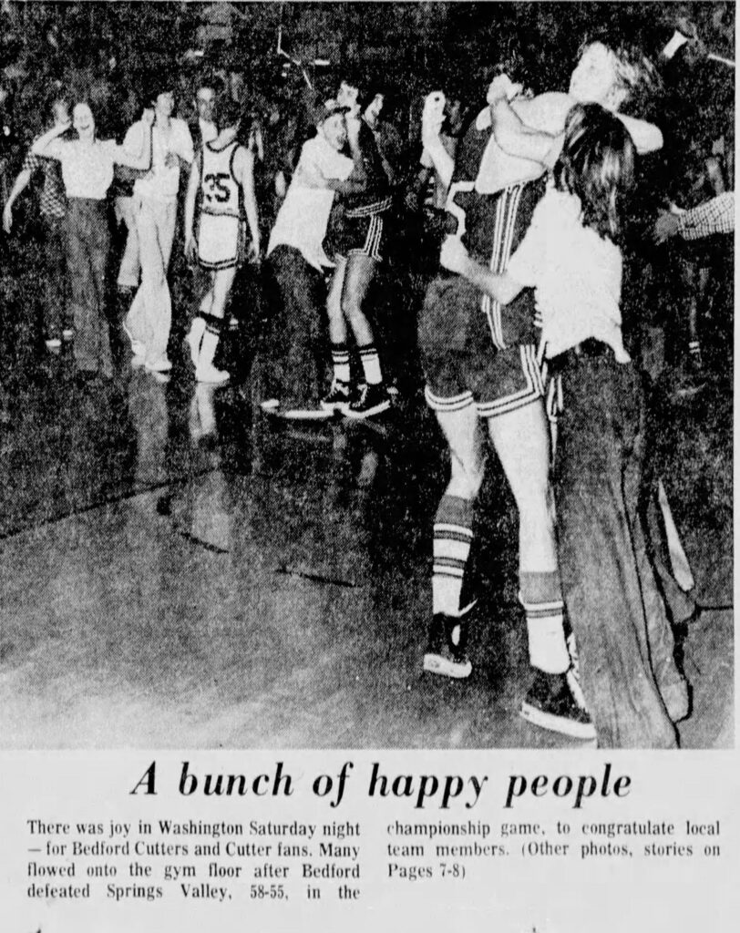 With five and a half minutes left in the regional final game, the Blackhawks were ahead of Bedford by eight points. I was standing still now, more relaxed, my hands clasped behind my back, watching and waiting for Larry to explode into a scoring spree that had yet to come. At this juncture, one sports reporter remembered hearing “fans from French Lick and West Beden making plans for the trip to Evansville” for the semi-state.