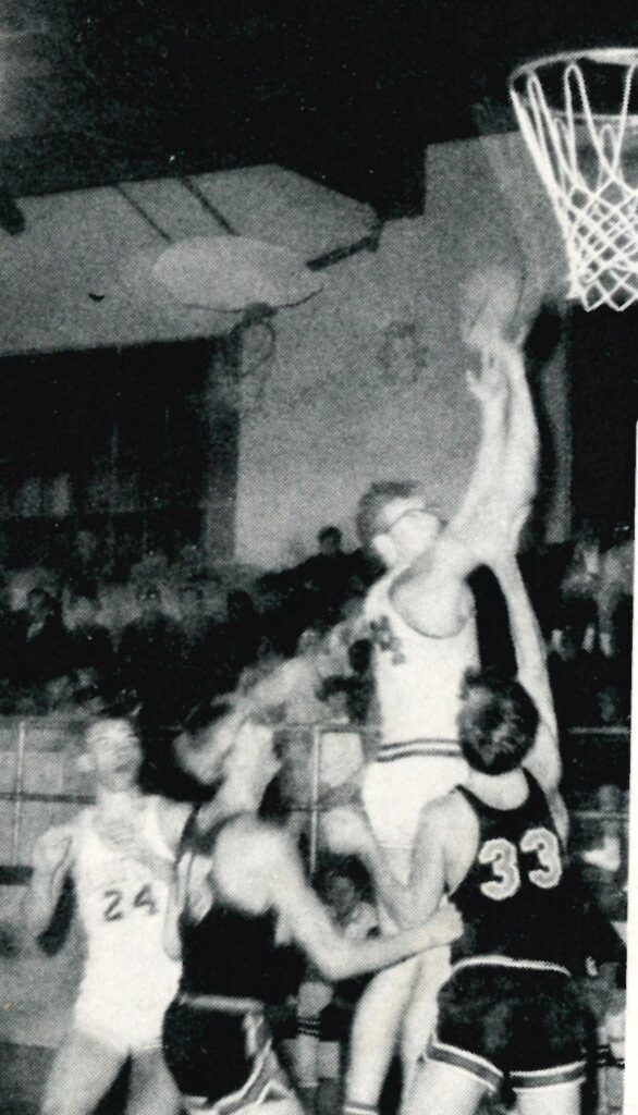 Beezer Carnes, scoring here against Bedford. He was his team’s second leading scorer in that game, two points behind Larry. (Paoli Republican)