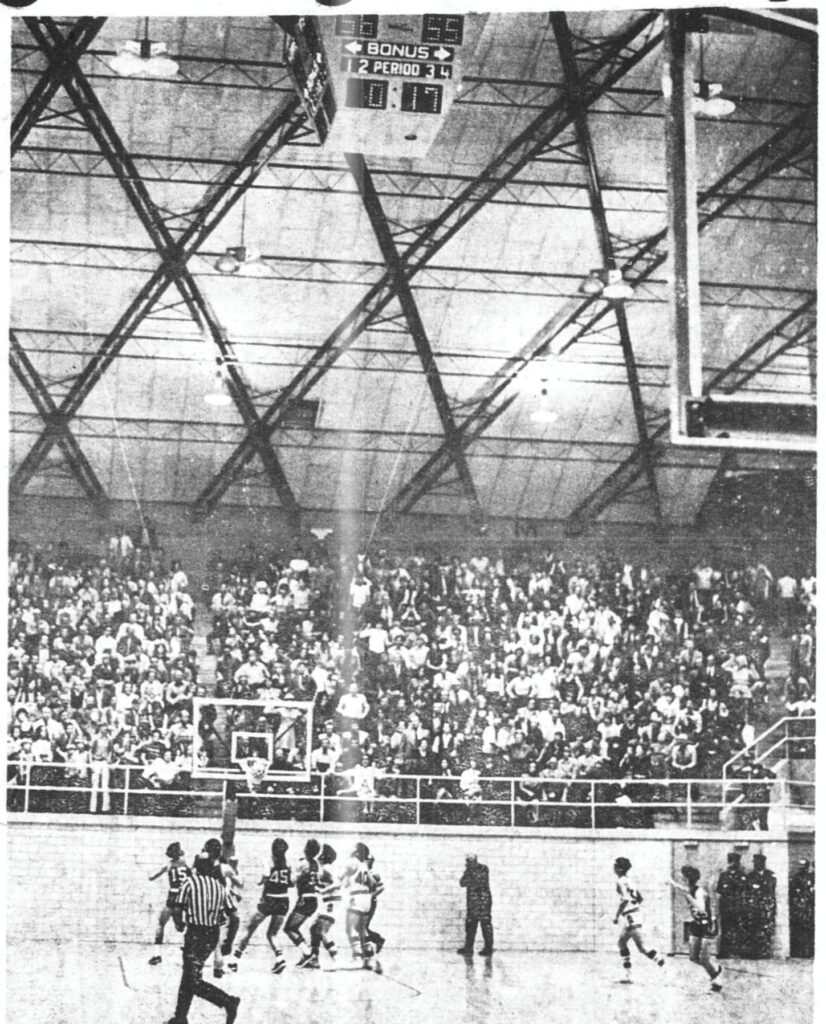 Seven thousand fans in Washington High School’s “Hatchet House” in a regional game in the early 1970s. I would watch Larry Bird play in a later regional final game in 1974, standing at the edge of the gym floor in the far-right corner. (Jasper Herald)