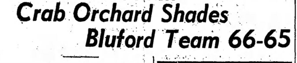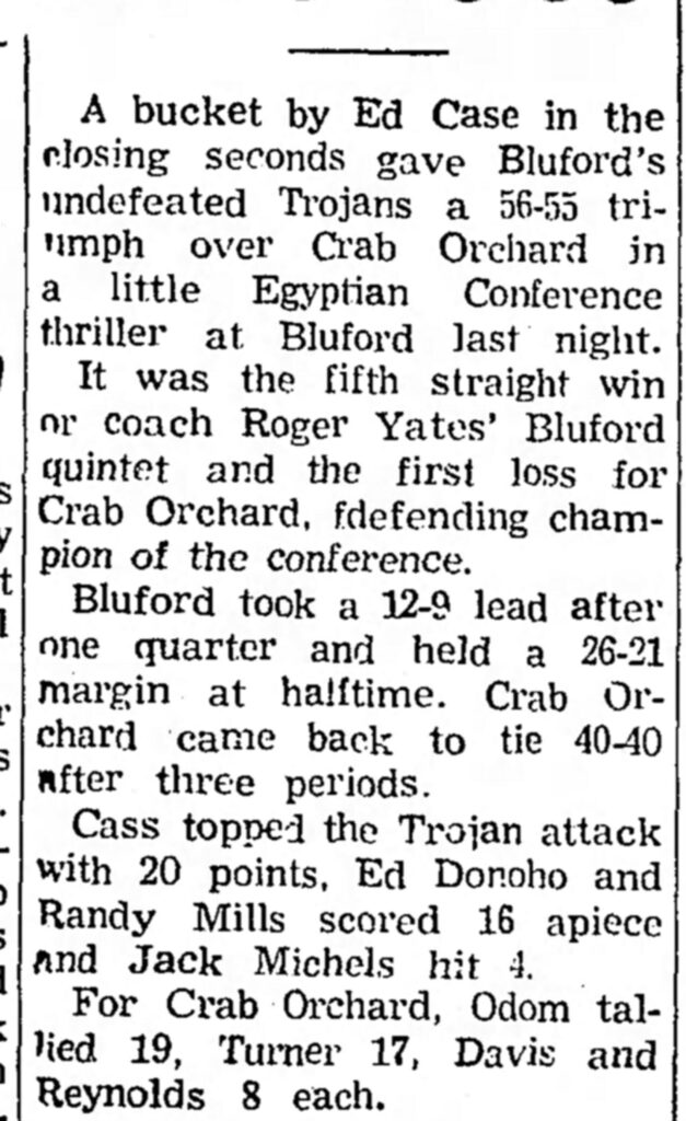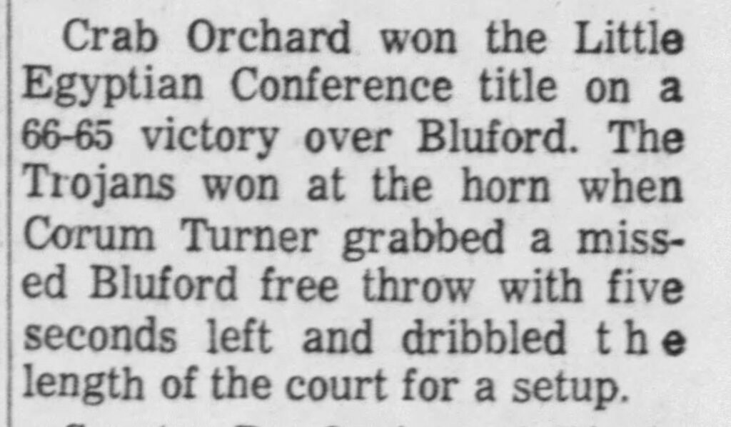 Crab Orchard was a long-established small school powerhouse in southern Illinois basketball, wining the regular conference title year after year. In my junior season Crab Orchard had an incredible shooting guard, a senior named Corum Turner. We had defeated them on a last-minute basket earlier than season and I had sixteen points in that game. Ed Case, however, hit the winning shot for Bluford.