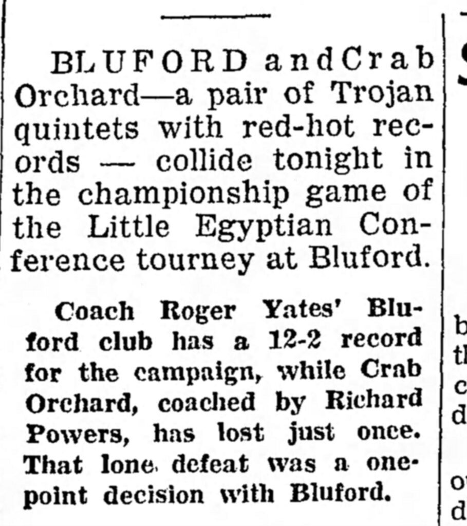 Bluford made quick work of our first two opponents, easily beating a tough Thompsonville squad in the semi-final round. Bluford’s Ed Donoho grabbed thirty points in the win. Meanwhile, Crab Orchard High School was demolishing teams in their bracket.